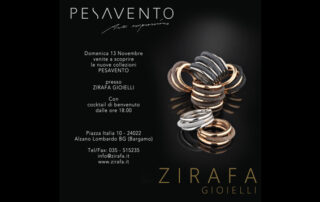 On Sunday, November 13 th the Zirafa Jewelry presents the PESAVENTO New Collections. We wait you in Piazza Italia 10 - 24022 Alzano Lombardo BG (Bergamo) From 14.00 there will be a cocktail reception for our customers. Tel/Fax: 035 - 515235 info@zirafa.it www.zirafa.it download pdf
